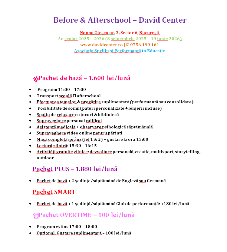 Centrul educational David Center din Bucuresti - se adreseaza parintilor cu copii cu varste de la 1,4 luni cresa),continuand cu gradinita pana la 11 ani ,la afterschool ,oferindu-le un cadru instructiv-educativ de cea mai buna calitate, activitati creative si recreative propice dezvoltarii armonioase prin intermediul unui personal didactic si nedidactic calificat si cu experienta in domeniu si prin mijloace si metode didactice de ultima generatie.